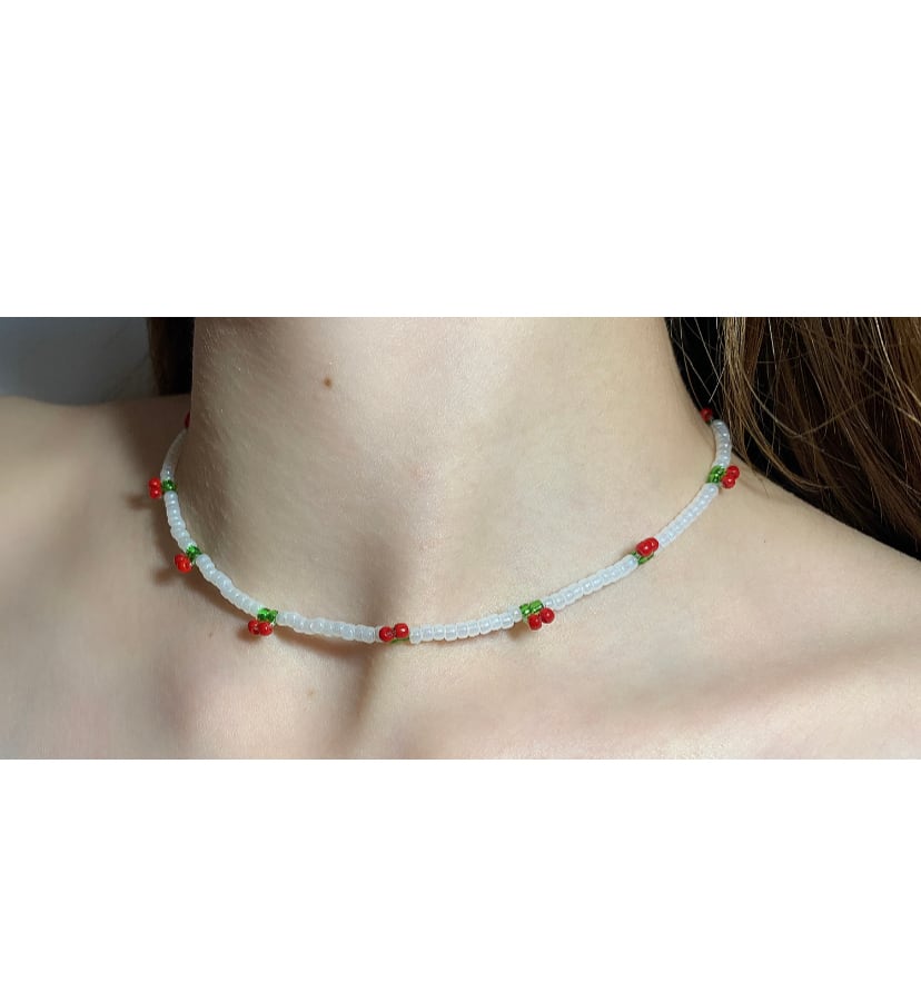 白いガラスビーズのベースに、ちっちゃいチェリーがたくさんついたガーリーなビーズネックレスです〜❤︎